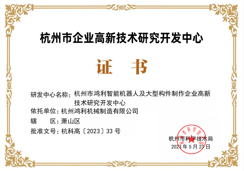 二、自市研發中心通過之后,公司進一步加強成果產業化,提升產品的技術含量,在2023年7月申報了省級高新技術企業研發中心,2023年11月6日,我司申報的《浙江省鴻利大型金屬構件智能制造高新技術企業研究開發中心》順利通過備案公示。